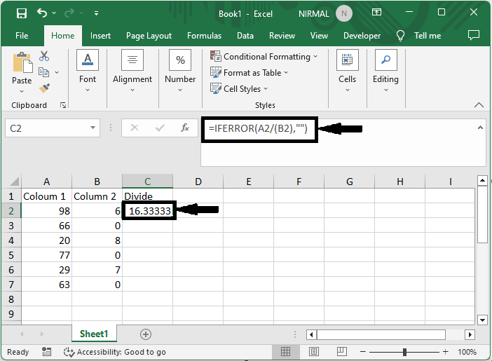 首先,單擊一個空單元格,輸入公式`=IFERROR(A2/(B2),"")`,然後單擊Enter鍵以獲取第一個值。