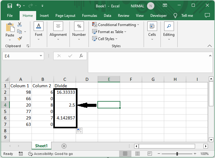 在這裡,我們將首先使用公式獲取任何一個值,然後使用自動填充柄完成任務。讓我們來看一個簡單的過程,瞭解如何去除Excel中的除以零錯誤(#DIV/0!)。