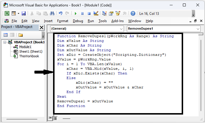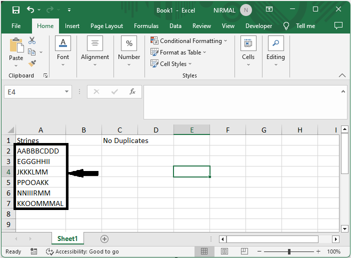 在這裡,我們將首先使用 VBA 建立一個使用者定義的函式,然後使用公式,最後使用自動填充柄完成任務。讓我們來看一個簡單的流程,瞭解如何在 Excel 單元格的字串中去除重複字元或單詞。