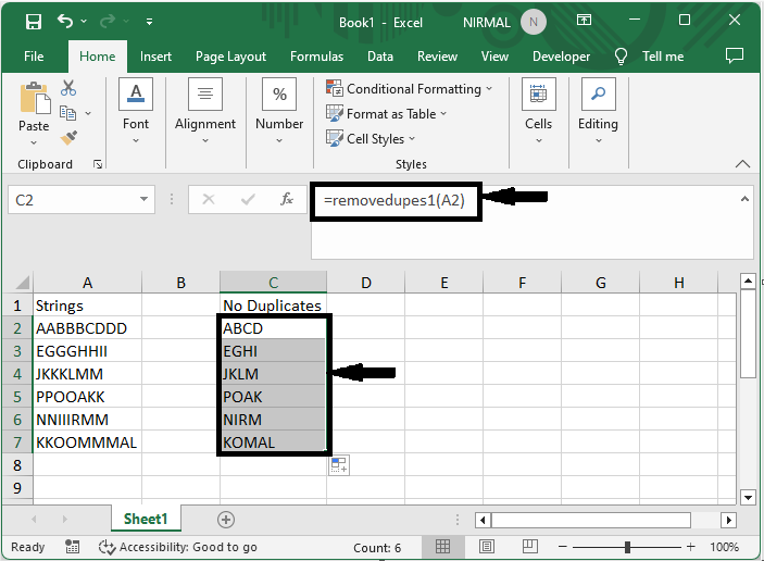 現在使用 Alt + Q 關閉 VBA。然後單擊一個空單元格,輸入公式 =removedupes1(A2),然後單擊 Enter 獲取第一個值。然後使用自動填充柄向下拖動。