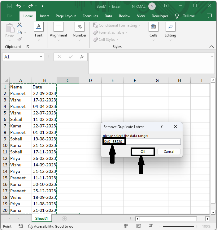 在這裡,我們將首先建立一個VBA模組,然後執行它來完成任務。讓我們來看一個簡單的過程,瞭解如何在Excel中刪除重複行但保留最新日期的行。