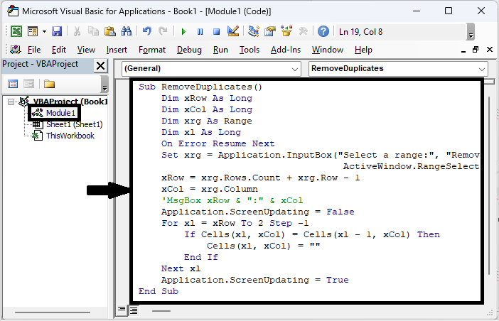 在這裡,我們將首先建立一個 VBA 模組,然後執行程式碼以完成任務。因此,讓我們來看一個簡單的過程,瞭解如何在 Excel 中刪除重複項但保留其餘行值。