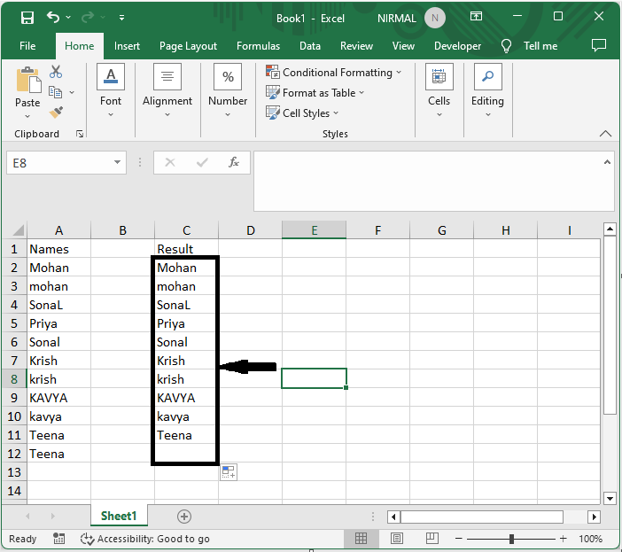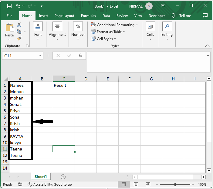 考慮一個Excel工作表,其中包含一個包含區分大小寫名稱的重複項列表,類似於下圖。