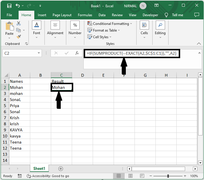 首先,單擊一個空單元格,在本例中為單元格C2,然後輸入公式=IF(SUMPRODUCT(--EXACT(A2,$C$1:C1)),"",A2),然後單擊Enter以獲取值。在公式中,A2是包含原始資料的單元格,C1是當前單元格上方的單元格。