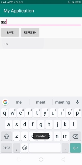 <?xml version = "1.0" encoding = "utf-8"?> <LinearLayout xmlns:android = "http://schemas.android.com/apk/res/android" xmlns:tools = "http://schemas.android.com/tools" android:layout_width = "match_parent" android:layout_height = "match_parent" tools:context = ".MainActivity" android:orientation = "vertical"> <EditText android:id = "@+id/name" android:layout_width = "match_parent" android:hint = "Enter Name" android:layout_height = "wrap_content" /> <LinearLayout android:layout_width = "wrap_content" android:layout_height = "wrap_content"> <Button android:id = "@+id/save" android:text = "Save" android:layout_width = "wrap_content" android:layout_height = "wrap_content" /> <Button android:id = "@+id/refresh" android:text = "Refresh" android:layout_width = "wrap_content" android:layout_height = "wrap_content" /> </LinearLayout> <ListView android:id = "@+id/listView" android:layout_width = "match_parent" android:layout_height = "wrap_content"> </ListView> </LinearLayout>