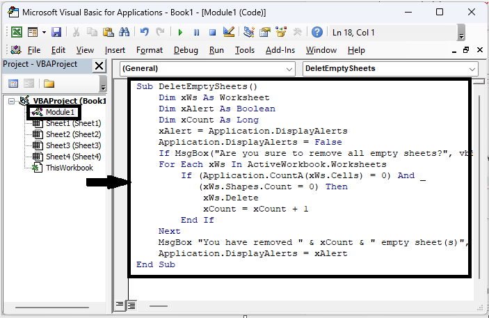 在這裡,我們將首先插入一個VBA模組,然後執行它來完成任務。讓我們來看一個簡單的過程,學習如何在Excel中從工作簿中刪除空工作表。