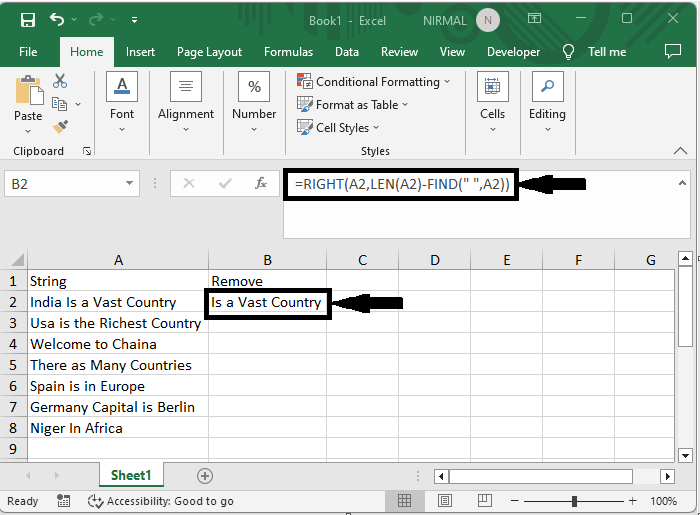 首先,要刪除第一個單詞,請單擊一個空單元格,在本例中為單元格 B2,然後輸入公式 =RIGHT(A2,LEN(A2)-FIND(" ",A2)) 並單擊回車鍵以獲取值。在公式中,A2 是包含資料的單元格。
