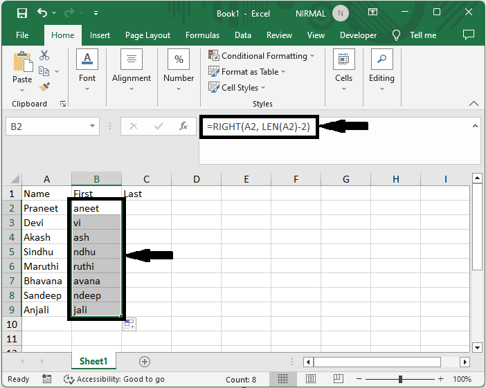 首先,要刪除前 X 個字元,請單擊一個空單元格並輸入公式 =RIGHT(A2, LEN(A2)-2),然後使用自動填充柄向下拖動。
