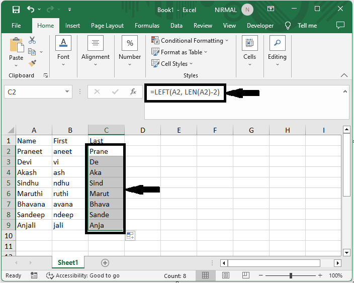 然後,要刪除最後 X 個字元,請單擊一個空單元格並輸入公式 =LEFT(A2, LEN(A2)-2),然後單擊回車以獲取第一個值。然後使用自動填充柄完成任務。