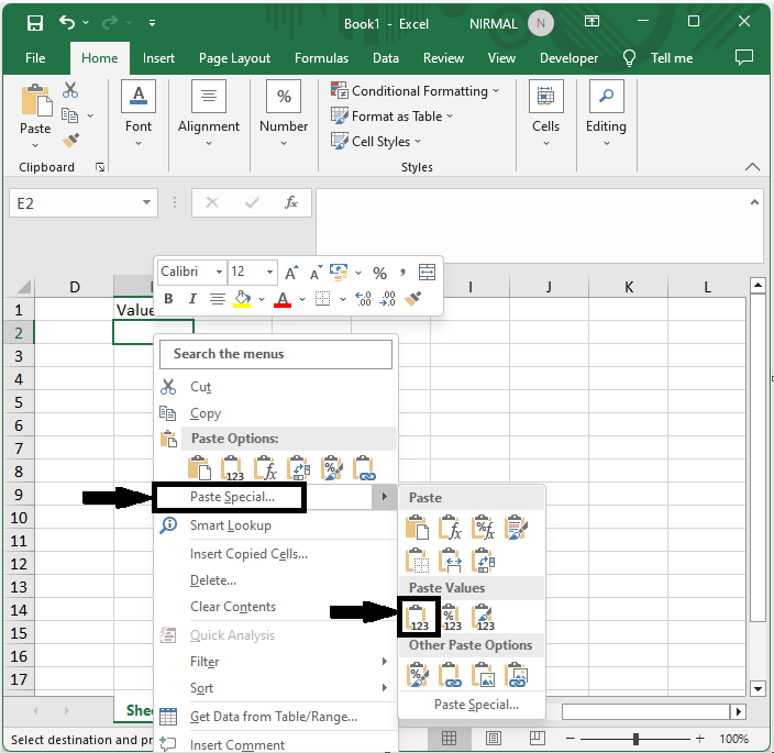 然後右鍵單擊一個空單元格,單擊“選擇性貼上”,然後選擇“值”以完成任務。