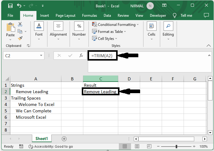 在這裡,我們將首先使用公式獲得任何一個結果,然後使用自動填充柄完成任務。讓我們來看一個簡單的過程,學習如何在Excel中去除前導和尾隨空格。