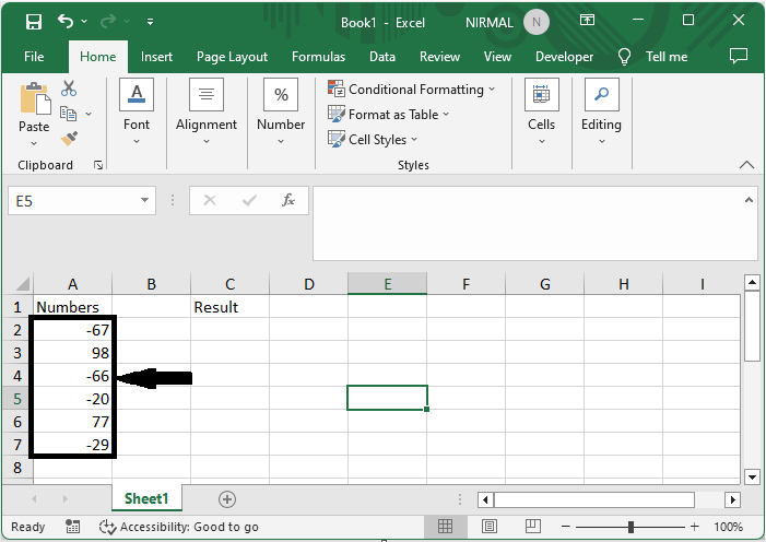 假設您有一個 Excel 表格,其中包含一系列包含數字和一些負數的單元格,類似於下圖。
