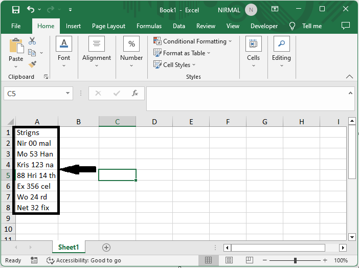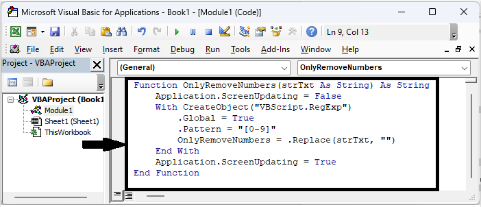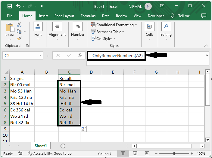 這裡,我們將首先使用VBA建立一個使用者自定義函式,然後使用公式來完成任務。讓我們來看一個簡單的過程,瞭解如何在Excel中從包含文字和數字的單元格中刪除數字。