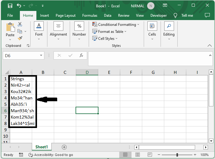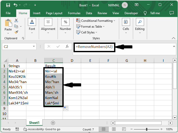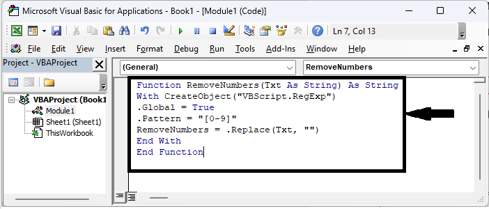 在這裡,我們將首先使用VBA建立一個公式,然後使用該公式來完成任務。讓我們來看一個簡單的過程,學習如何在Excel中從文字字串中去除數字。