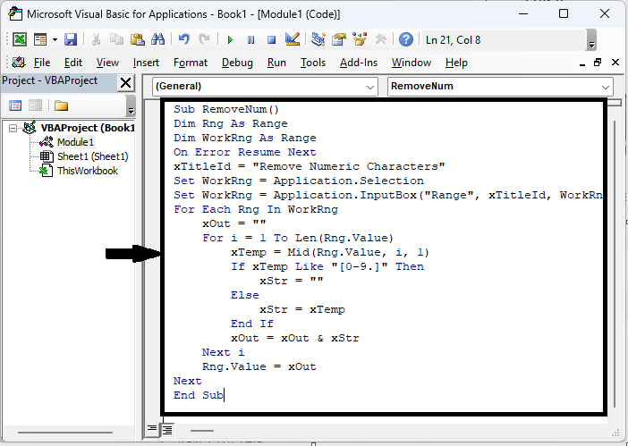 在這裡,我們可以透過建立 VBA 模組來完成任務。因此,讓我們來看一個簡單的過程來學習如何在 Excel 中從單元格中刪除數字字元。