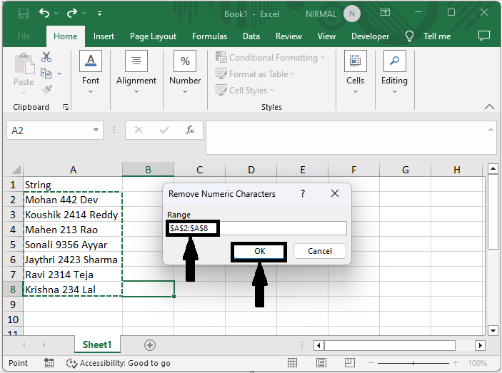 然後單擊 F5 執行模組。然後選擇單元格範圍並單擊“確定”以完成任務。然後您將看到數字字元將被刪除。