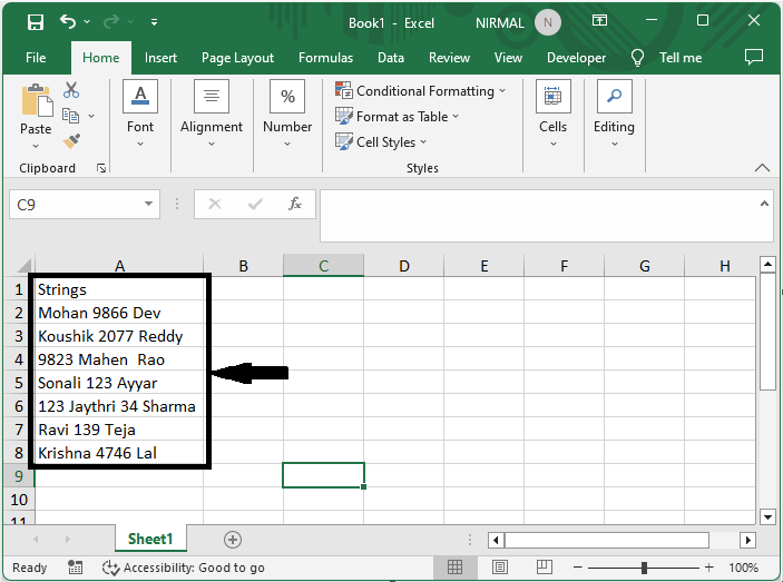 考慮一個 Excel 表格,其中您有一系列包含文字和數字的字串,類似於下圖。