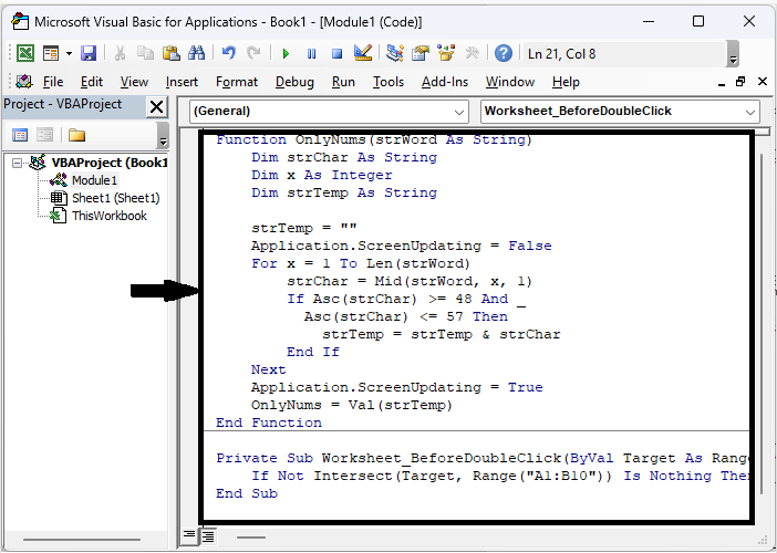 在這裡,我們將建立一個 VBA 模組,然後選擇單元格範圍來完成任務。因此,讓我們看看一個簡單的過程,瞭解如何在 Excel 中僅從包含數字和文字的單元格中刪除文字。