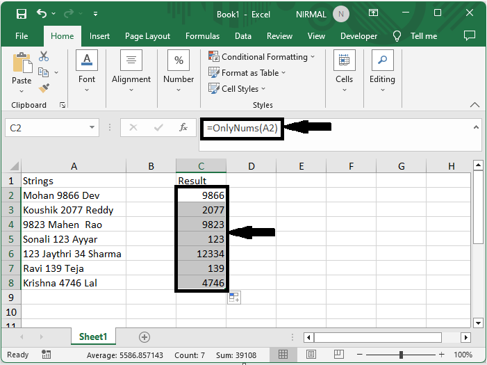 然後使用 Alt + Q 關閉 VBA。然後單擊一個空單元格並輸入公式 =OnlyNums(A2),單擊回車,然後使用自動填充柄向下拖動。