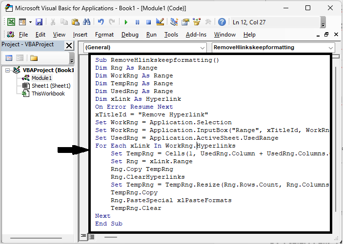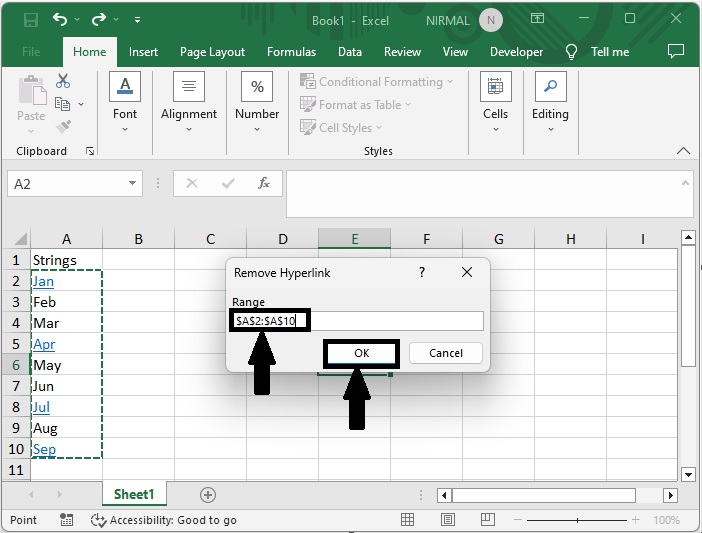 然後單擊 F5 執行模組。然後選擇單元格範圍並單擊“確定”以完成任務。然後您將看到超連結已被刪除。