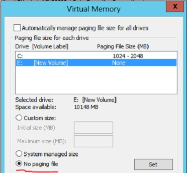 在本文中,我們在 E: 上設定了一個頁面檔案(系統管理),我們需要從 E: 中刪除該頁面檔案。所以在下圖中,一旦我們刪除它,頁面檔案就應該是“無分頁檔案”。