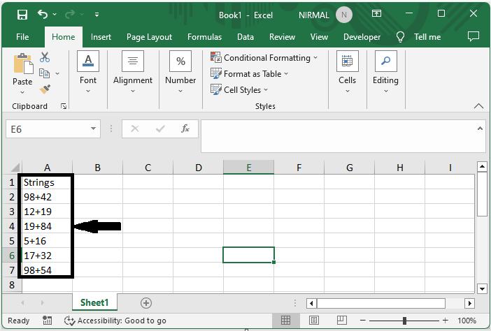 考慮一個Excel表格,其中包含一系列在它們之間帶有加號或減號的字串,類似於下面的影像。