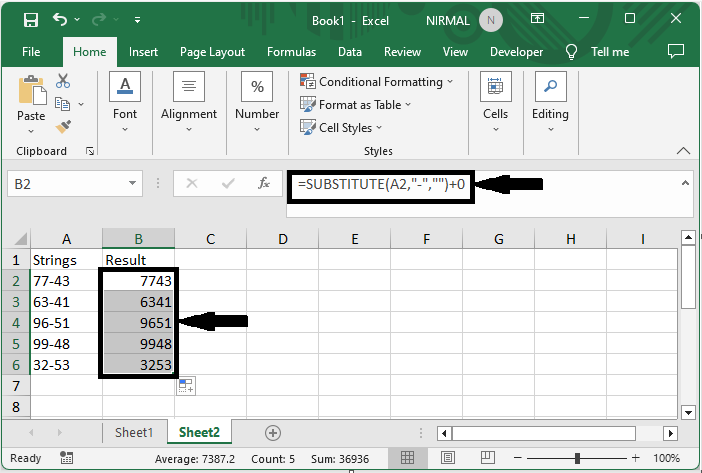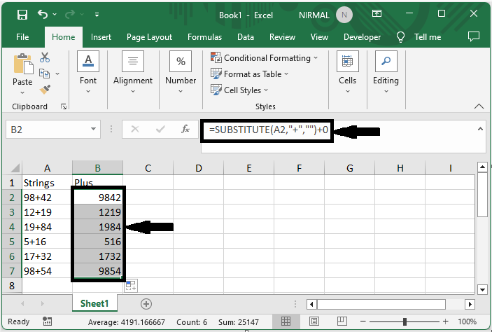 首先,要刪除列表中的加號,單擊一個空單元格(在本例中為單元格B2),然後輸入公式`=SUBSTITUTE(A2,"+","")+0`,然後單擊回車鍵以獲取第一個值。然後使用自動填充柄向下拖動。