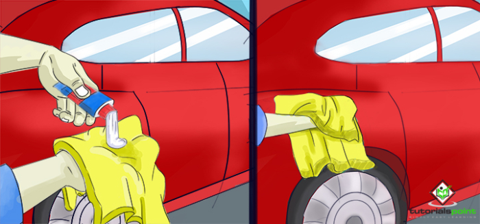 步驟 2——擠一點白色牙膏到超細纖維布上,然後以圓周運動輕輕擦拭劃痕表面。