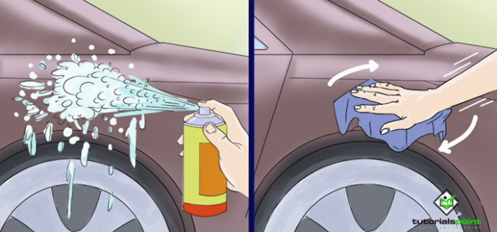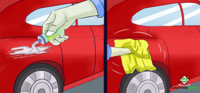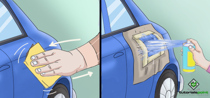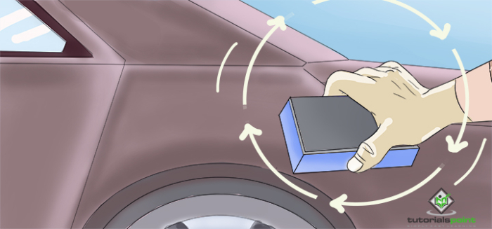 步驟 2——底漆幹了之後,下一步是在劃痕部位塗上與汽車顏色匹配的油漆。噴灑適量的匹配油漆,並使其乾燥。在拋光墊上放一點汽車蠟,然後在剛塗過漆的區域擦拭,直到它與其餘表面相匹配。最好以圓周運動擦拭拋光墊。
