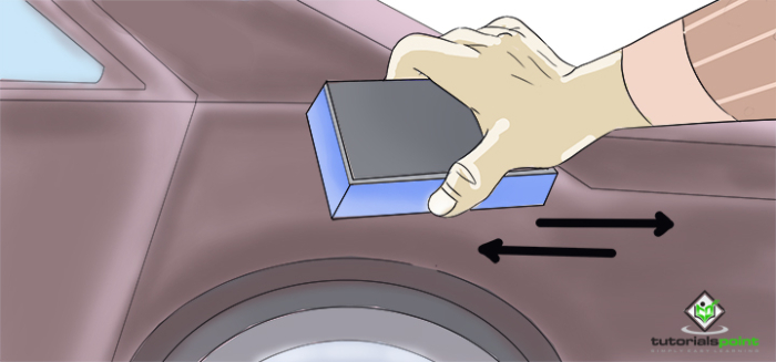 步驟 1——在劃痕區域擦拭砂紙,直到你完全去除該部分的油漆,並看到汽車的金屬部分。使用砂紙時要輕柔,因為你不想留下任何新的劃痕。接下來,你需要塗抹底漆,但在此之前,使用遮蔽膠帶和紙張覆蓋汽車的其他部分。現在,在受影響區域噴塗底漆,並使其乾燥。