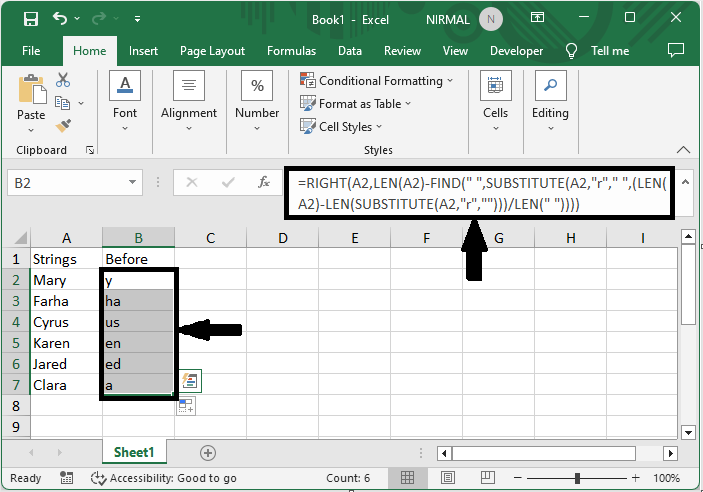 =RIGHT(A2,LEN(A2)-FIND(" ",SUBSTITUTE(A2,"r"," ",(LEN(A2)-LEN(SUBSTITUTE(A2,"r","")))/LEN(" ")))) 並單擊回車以獲取第一個值。然後使用自動填充柄向下拖動。