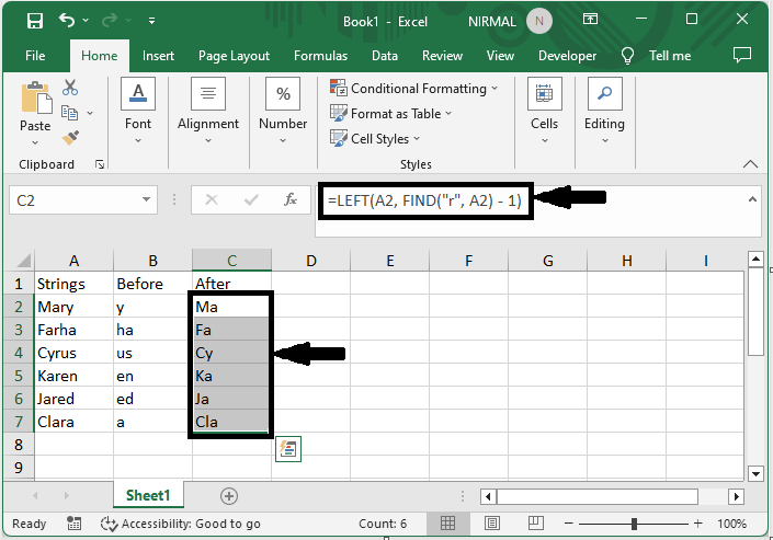 現在要刪除特定字元之後的文字,請單擊一個空單元格並輸入公式為 =LEFT(B5,FIND(" ",SUBSTITUTE(B5,"r"," ",LEN(A2)-LEN(SUBSTITUTE(A2," ",""))))-1) 並單擊回車。然後使用自動填充柄向下拖動。