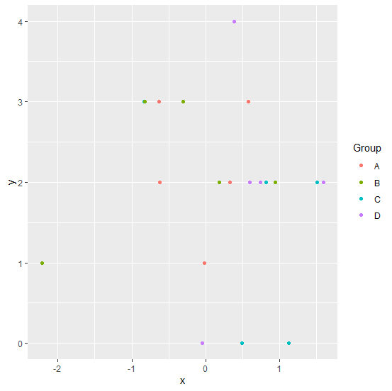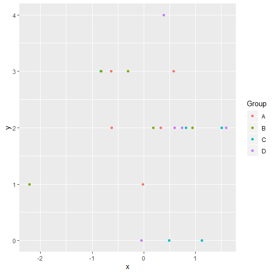 x y Group 1 -0.62645381 3 A 2 0.18364332 2 B 3 -0.83562861 3 C 4 1.59528080 2 D 5 0.32950777 2 A 6 -0.82046838 3 B 7 0.48742905 0 C 8 0.73832471 2 D 9 0.57578135 3 A 10 -0.30538839 3 B 11 1.51178117 2 C 12 0.38984324 4 D 13 -0.62124058 2 A 14 -2.21469989 1 B 15 1.12493092 0 C 16 -0.04493361 0 D 17 -0.01619026 1 A 18 0.94383621 2 B 19 0.82122120 2 C 20 0.59390132 2 D > library(ggplot2)