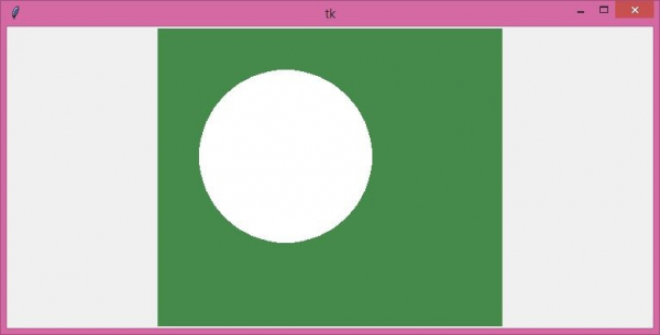 #Import tkinter library from tkinter import * #Create an instance of tkinter frame or window win= Tk() #Set the geometry of tkinter frame win.geometry("750x350") #Create a canvas and an oval canvas= Canvas(win, width=400, height=350,bg= "#458a4a") canvas.create_oval(50,50,250,250, fill="white", outline="") canvas.pack() win.mainloop()