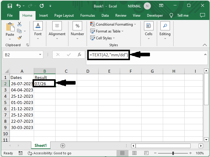 首先,單擊一個空單元格,在本例中為單元格 C2,並輸入公式 =TEXT(A2,"mm/dd"),然後單擊 Enter 以獲取值。在公式中,A2 是包含原始資料的單元格。