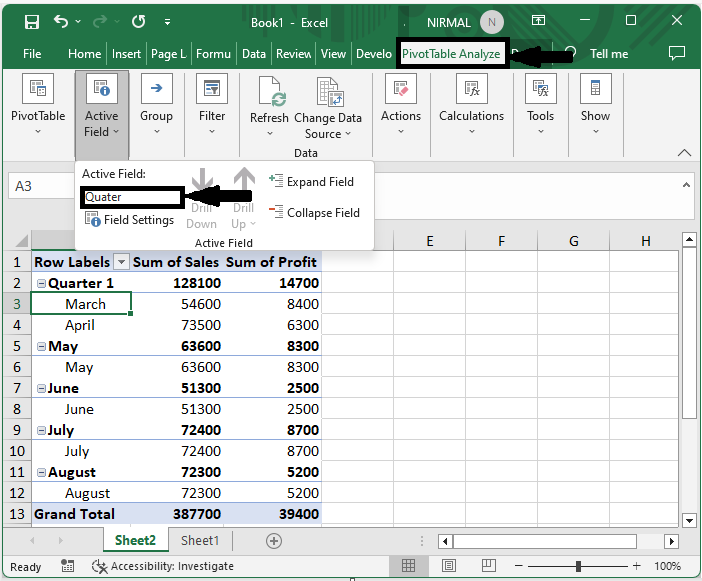 現在要重新命名行標籤,請單擊該行的任何單元格,單擊“分析”,編輯“活動欄位”下的名稱,然後單擊回車。