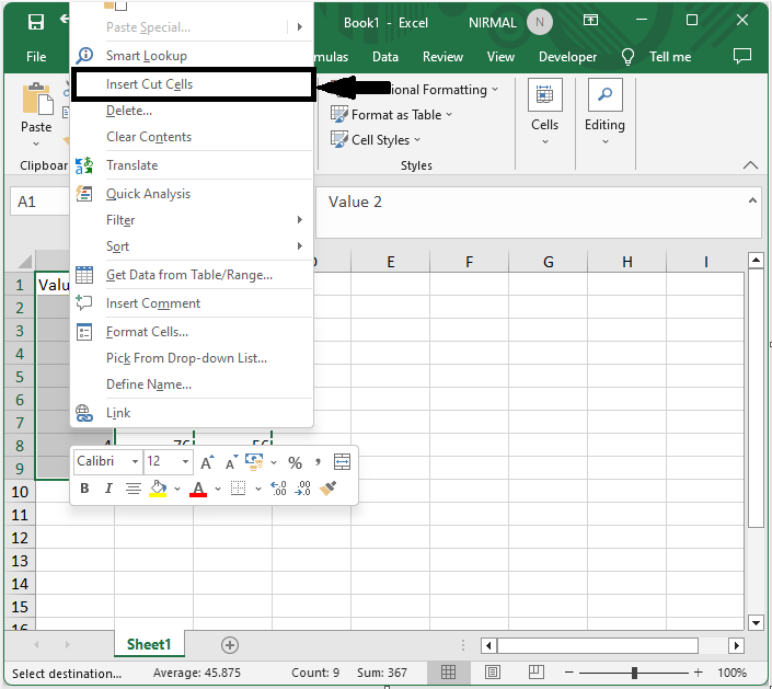 首先,選擇單元格範圍,然後右鍵單擊單元格並選擇“剪下”。