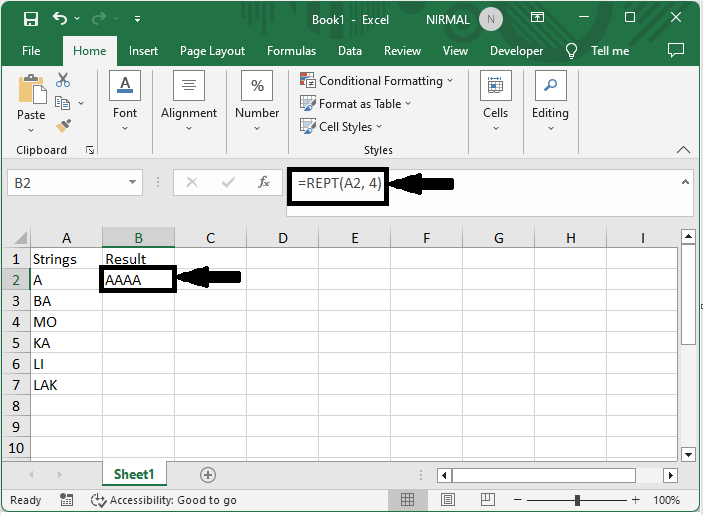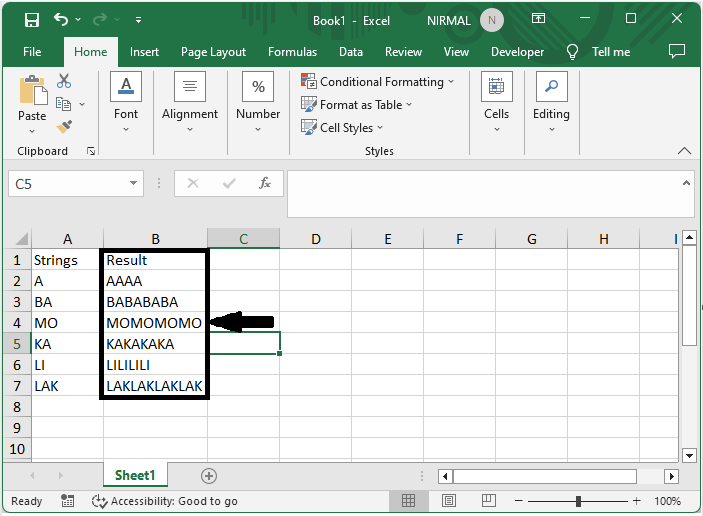 這裡我們將首先獲取任何一個值,然後使用自動填充柄來完成任務。讓我們來看一個簡單的過程,瞭解如何在Excel單元格中重複某個字元N次。