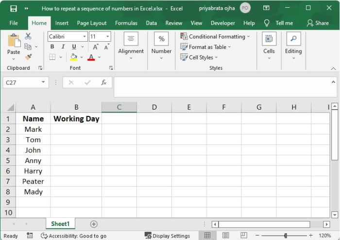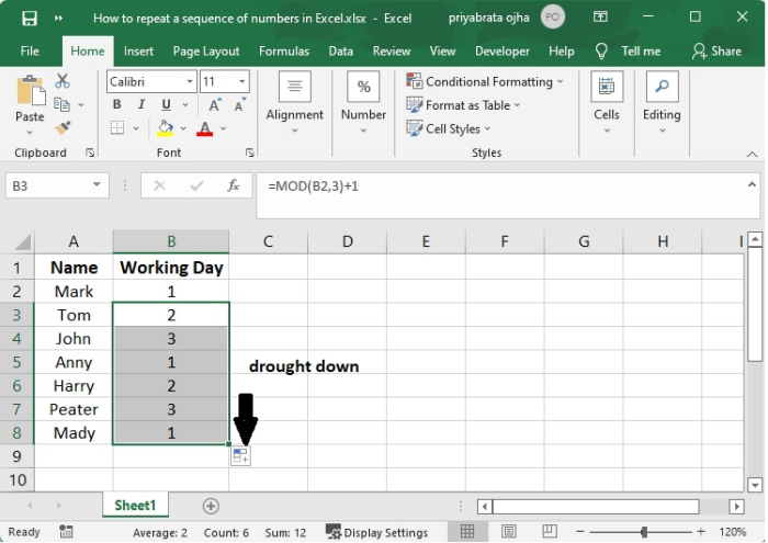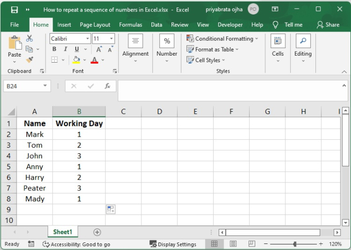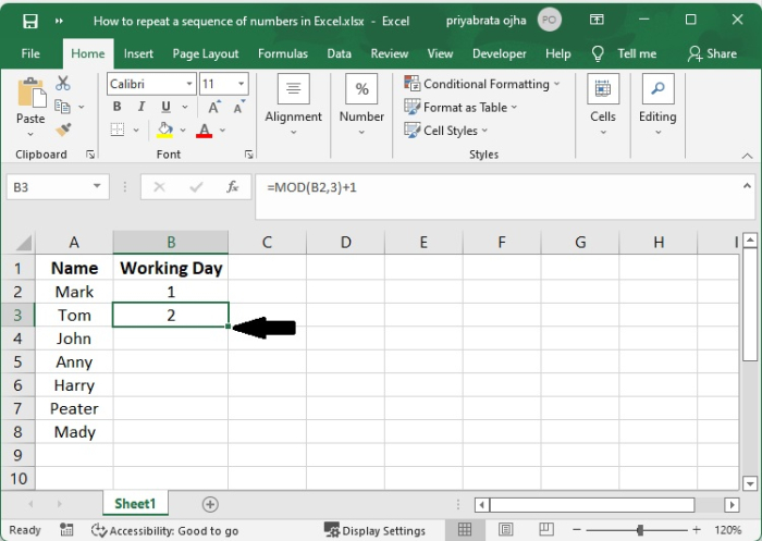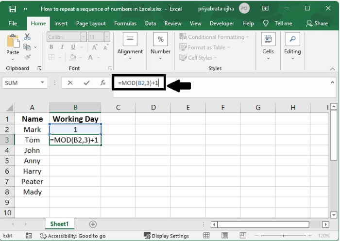 為了從公式中獲得準確的答案,您使用的序列號必須以數字 1 開頭。此公式只能用於重複簡單的數字序列;如果您希望重複文字字串序列,例如 A1001、A1002 和 A1003,它將無法為您工作,因為此公式僅適用於簡單的數字序列。