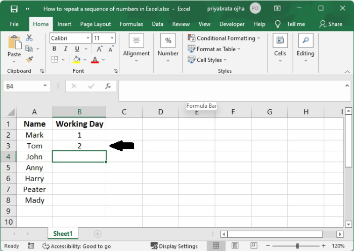 首先,手動將 1 輸入到單元格 B2 中作為 Mark 的工作日數。然後,轉到單元格 B3 並進行選擇。