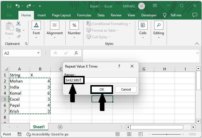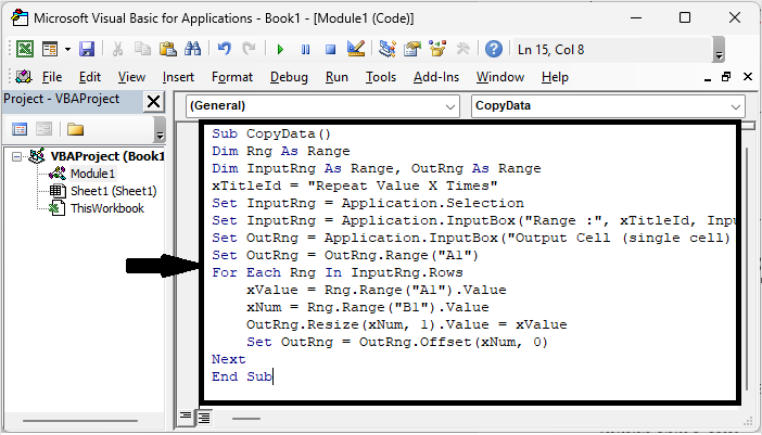 這裡我們將首先建立一個 VBA 模組,然後選擇資料範圍來完成任務。因此,讓我們看看一個簡單的過程,瞭解如何在 Excel 中將單元格值重複 x 次。