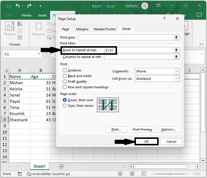 然後在名為“頂端重複行”的框中選擇要重複的列,然後單擊“確定”。