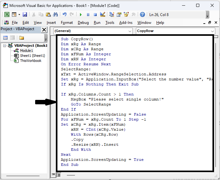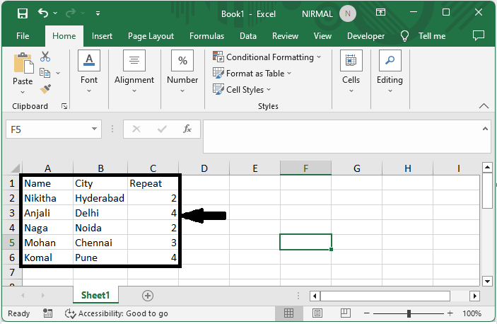 在這裡,我們將首先建立一個 VBA 模組,然後執行它來完成任務。讓我們來看一個簡單的流程,瞭解如何根據 Excel 中的另一列的值重複指定次數的行。