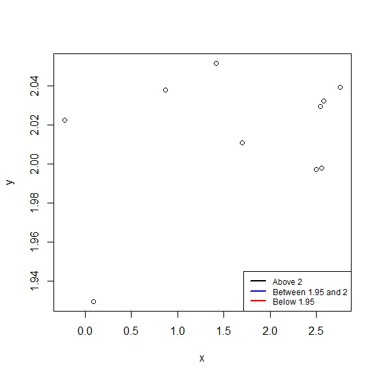 plot(x,y) legend("bottomright",legend=c("Above 2","Between 1.95 and 2","Below 1.95"), + lwd=2,cex=0.75,col=c("black","blue","red"),lty=c(1,1,1))輸出
