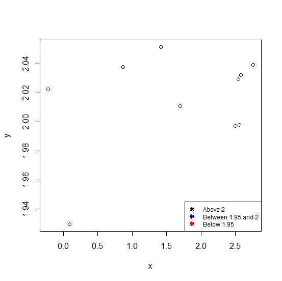 plot(x,y) legend("bottomright",legend=c("Above 2","Between 1.95 and 2","Below 1.95"), + lwd=2,cex=0.75,col=c("black","blue","red"),lty=c(NA,NA,NA),pch=c(8,8,8))輸出