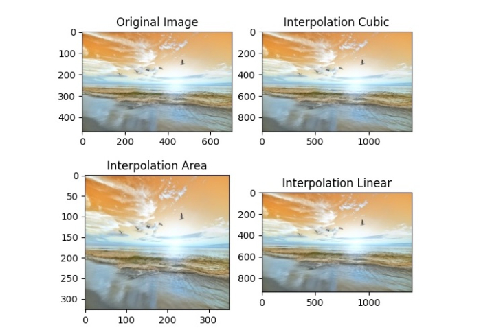 # import the required libraries import cv2 import matplotlib.pyplot as plt # read the input image img = cv2.imread('birds.jpg') # resize the image using different interpolations resize_cubic = cv2.resize(img,(0, 0),fx=2, fy=2, interpolation = cv2.INTER_CUBIC) resize_area = cv2.resize(img,(0, 0),fx=0.5, fy=0.7, interpolation = cv2.INTER_AREA) resize_linear = cv2.resize(img,(0, 0),fx=2, fy=2, interpolation = cv2.INTER_LINEAR) # display the original and resized images plt.subplot(221),plt.imshow(img), plt.title("Original Image") plt.subplot(222), plt.imshow(resize_cubic), plt.title("Interpolation Cubic") plt.subplot(223), plt.imshow(resize_area), plt.title("Interpolation Area") plt.subplot(224), plt.imshow(resize_linear), plt.title("Interpolation Linear") plt.show()