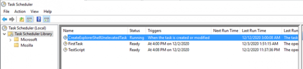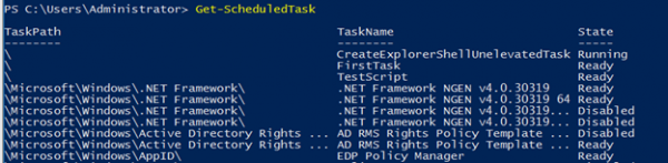 TaskPath TaskName State -------- -------- ----- \ CreateExplorerShellUnelevatedTask Running \ FirstTask Ready \ TestScript Ready