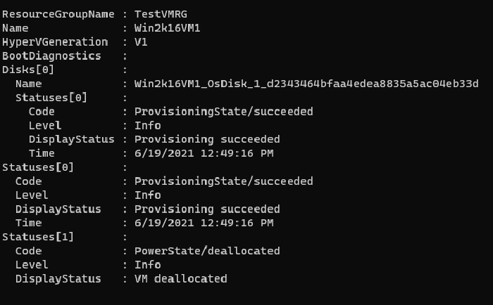 PS C:\> Get-AzVM -VMName Win2k16VM1 -ResourceGroupName TestVMRG -Status