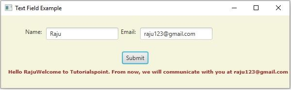 要建立一個文字欄位,您需要例項化此類,指向此類的建構函式。它從其超類 TextInputControl. 繼承了一個名為 text 的屬性。此屬性儲存當前文字欄位的內容。您可以使用 getText() 方法檢索此資料。