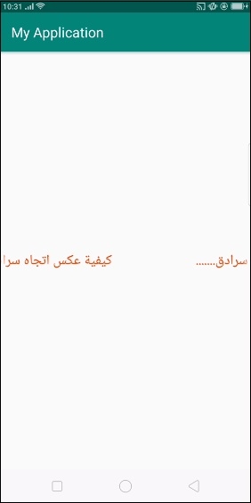 <?xml version = "1.0" encoding = "utf-8"?> <RelativeLayout xmlns:android = "http://schemas.android.com/apk/res/android" xmlns:tools = "http://schemas.android.com/tools" android:layout_width = "match_parent" android:gravity = "center" android:layout_height = "match_parent"> <TextView android:id = "@+id/text" android:textSize = "20dp" android:textAlignment = "center" android:layout_width = "match_parent" android:ellipsize = "marquee" android:layoutDirection = "rtl" android:textDirection = "rtl" android:fadingEdge = "horizontal" android:marqueeRepeatLimit = "marquee_forever" android:scrollHorizontally = "true" android:textColor = "#ff4500" android:text = "كيفية عكس اتجاه سرادق.....كيفية عكس اتجاه سرادق......." android:layout_height = "wrap_content" android:singleLine = "true" /> </RelativeLayout>